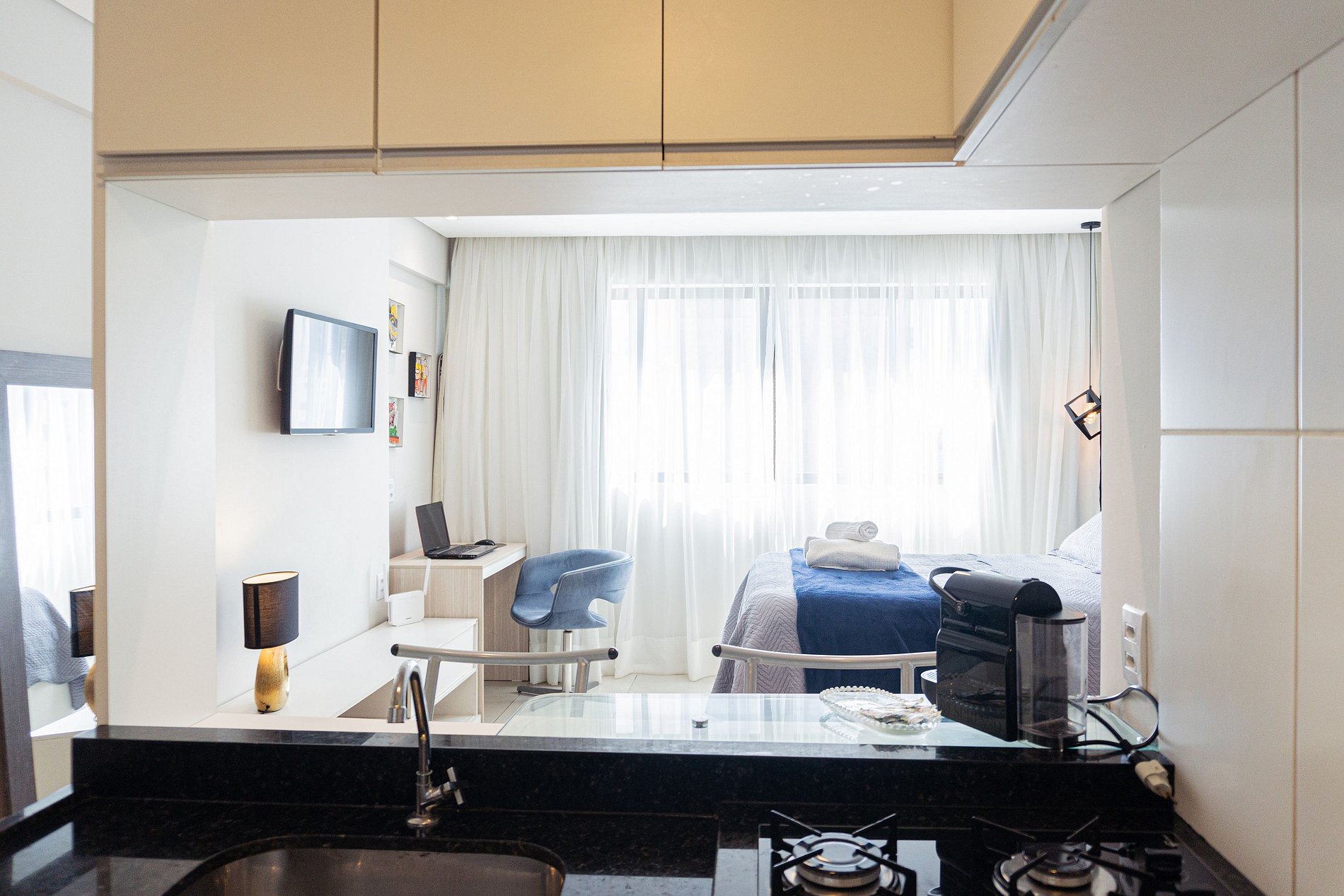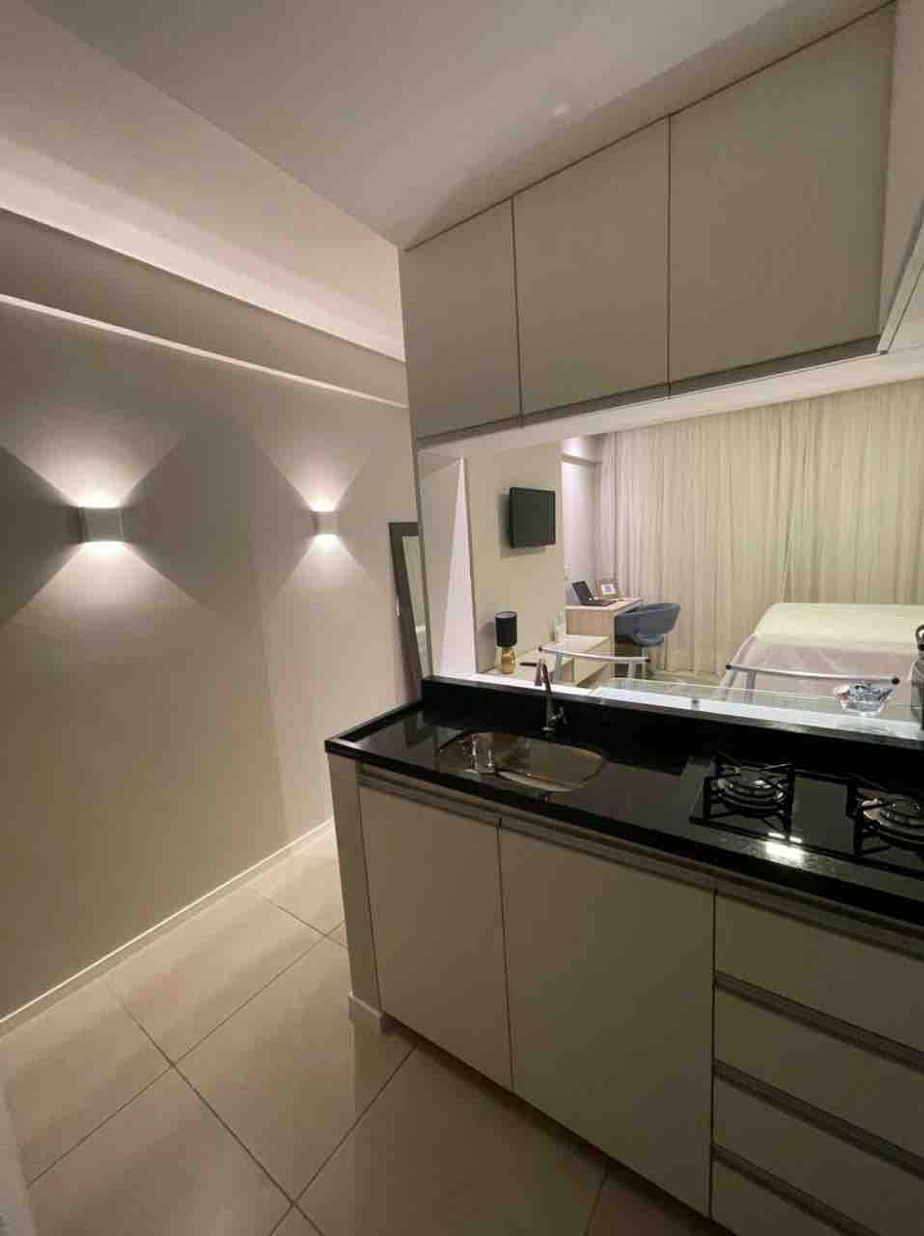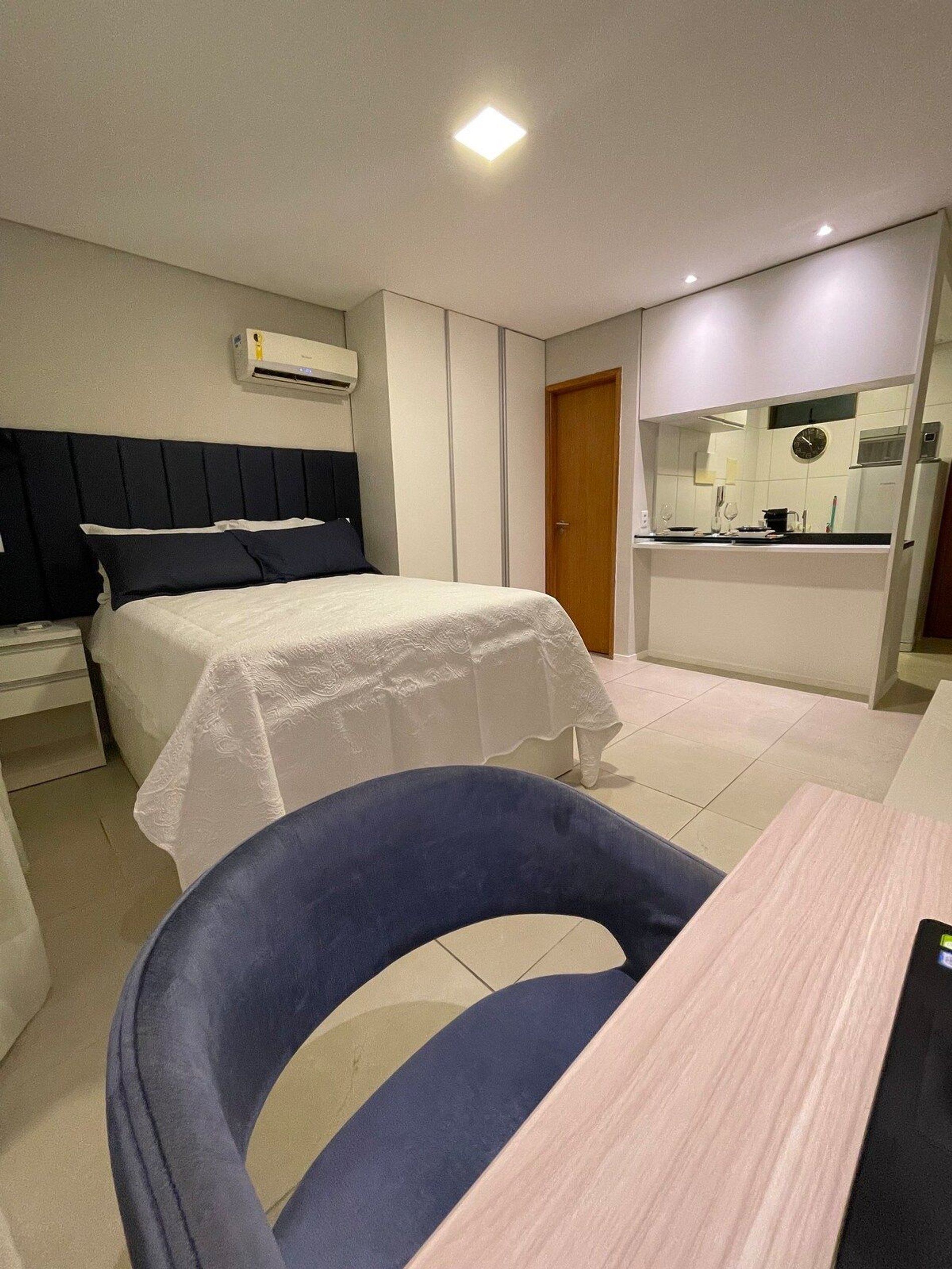 O local é super aconchegante e equipado. Cozinha americana, com todo mobiliário necessário para uma hospedagem confortável: - jogo de jantar, taças, eletrodomésticos -secador de cabelo, ferro de passar -Tv com smart com Netflix -ar condicionado -cortina com “blackout” -sabonete, shampoo, condicionador (cortesia) - vaga de estacionamento coberta.