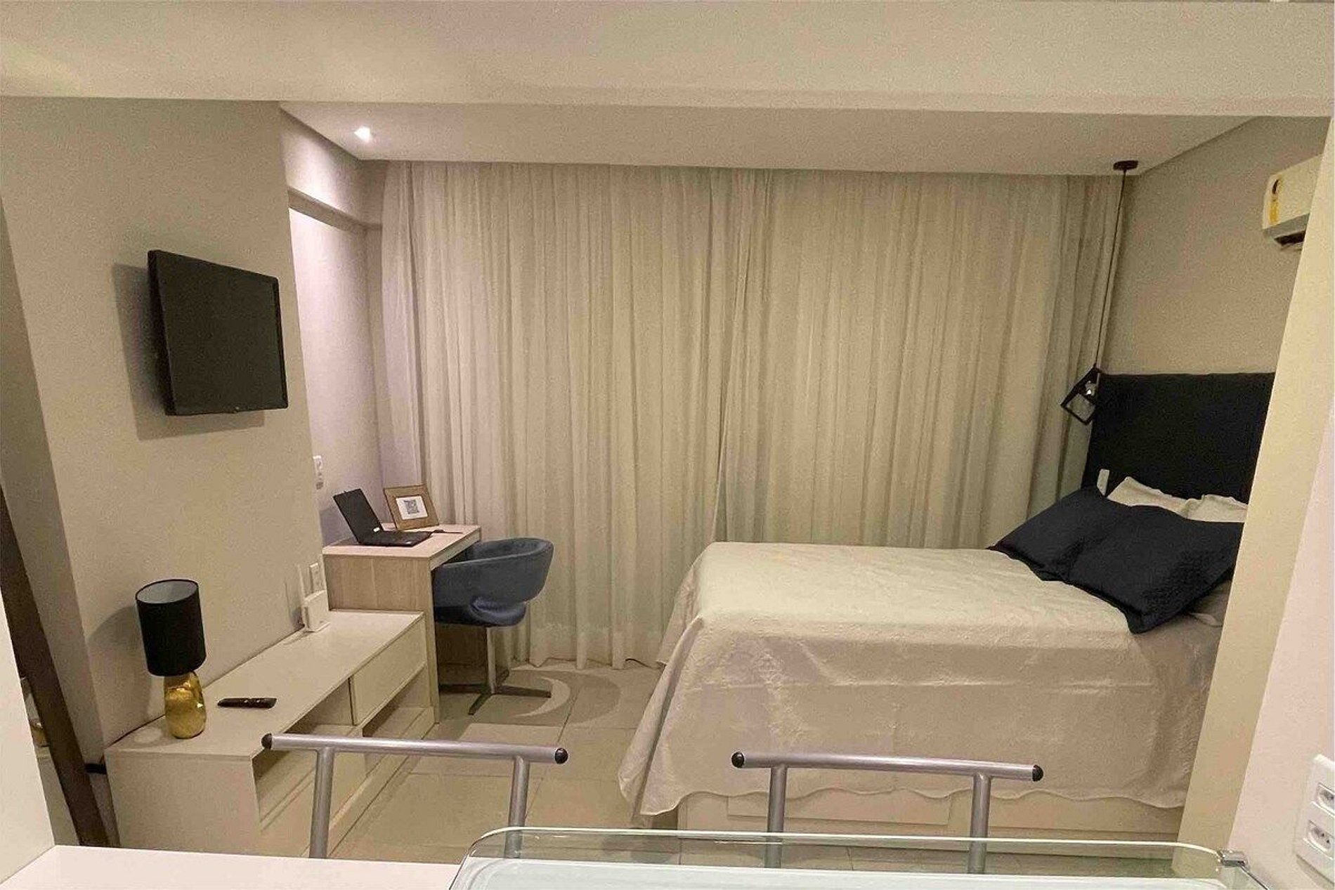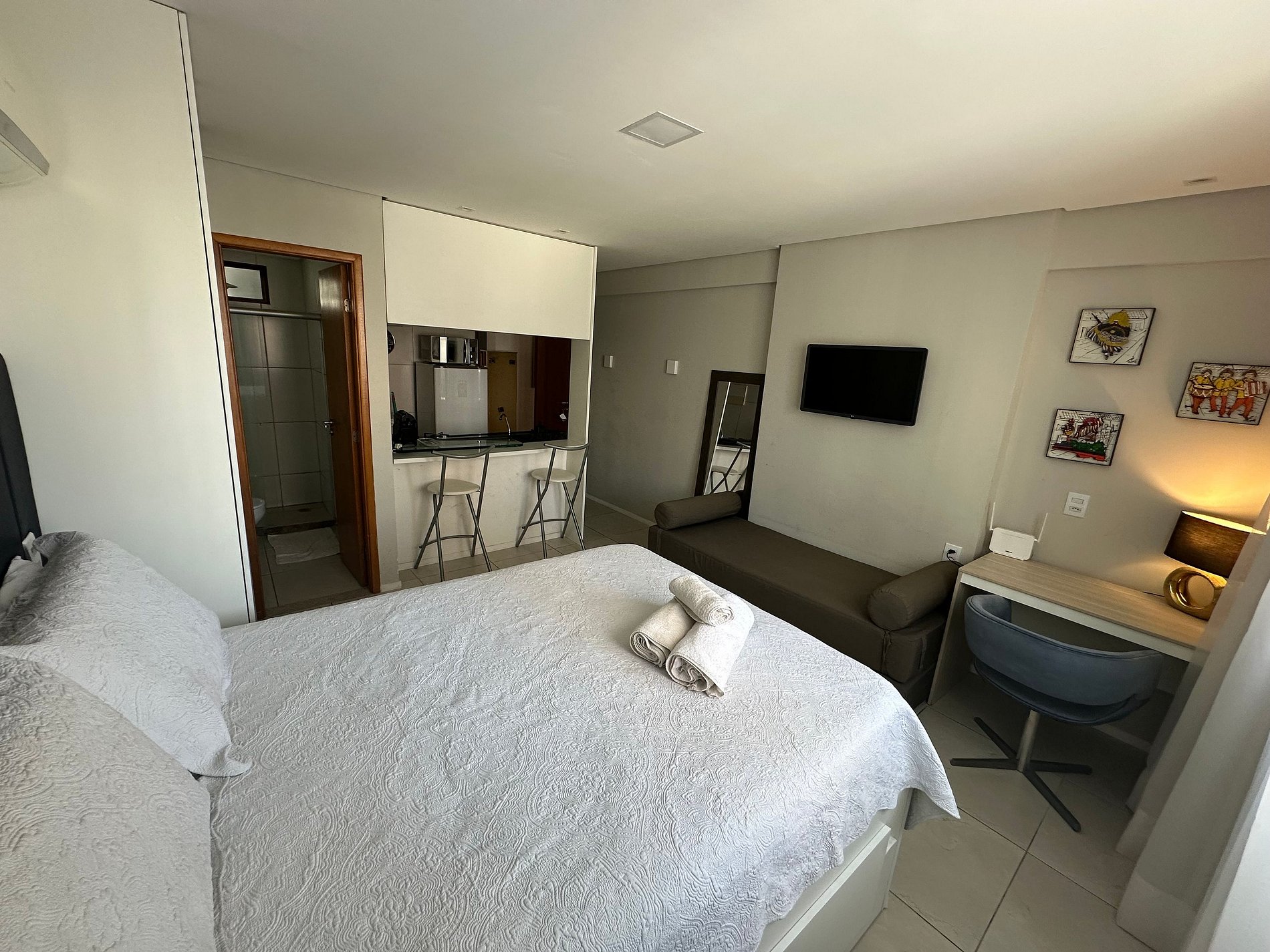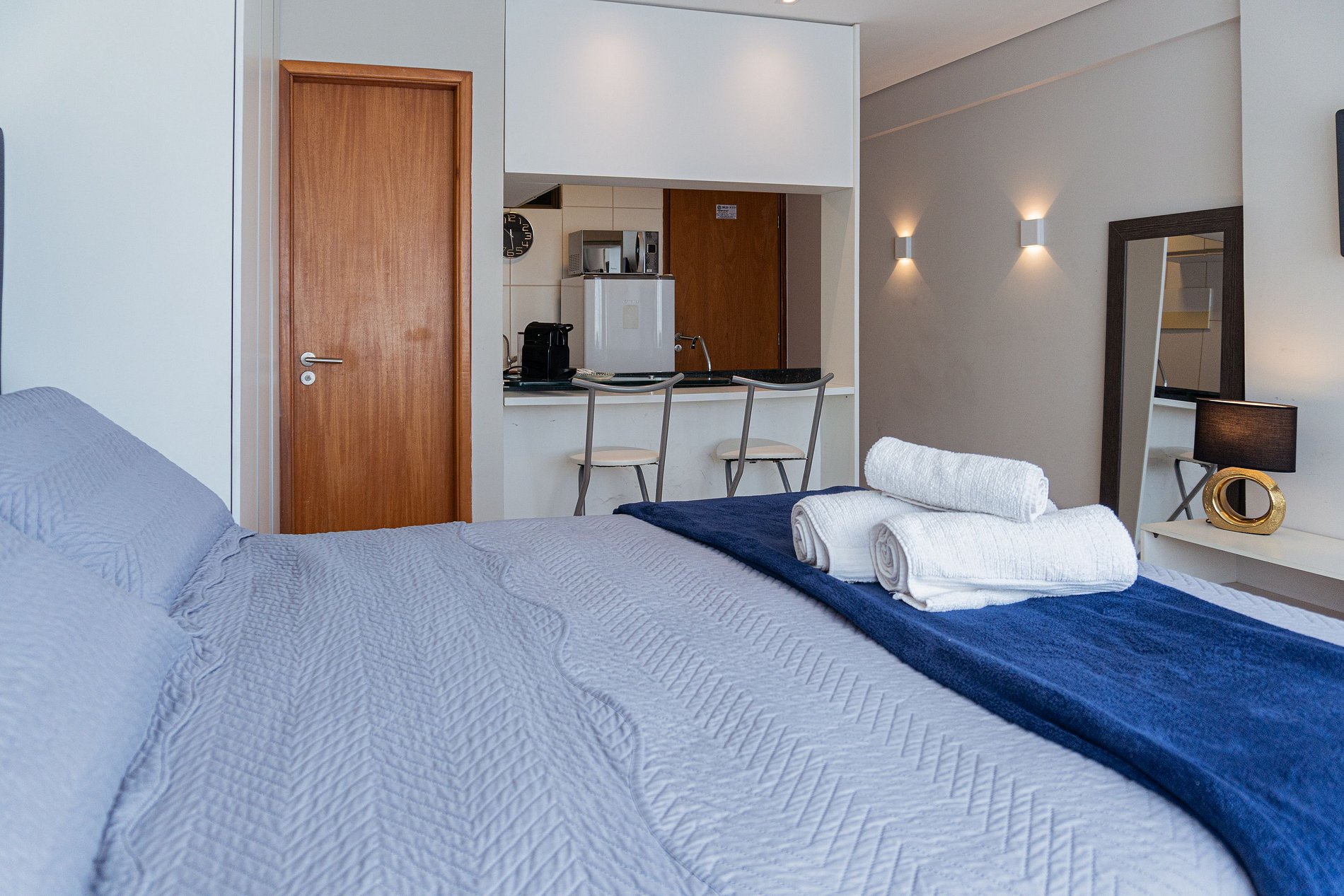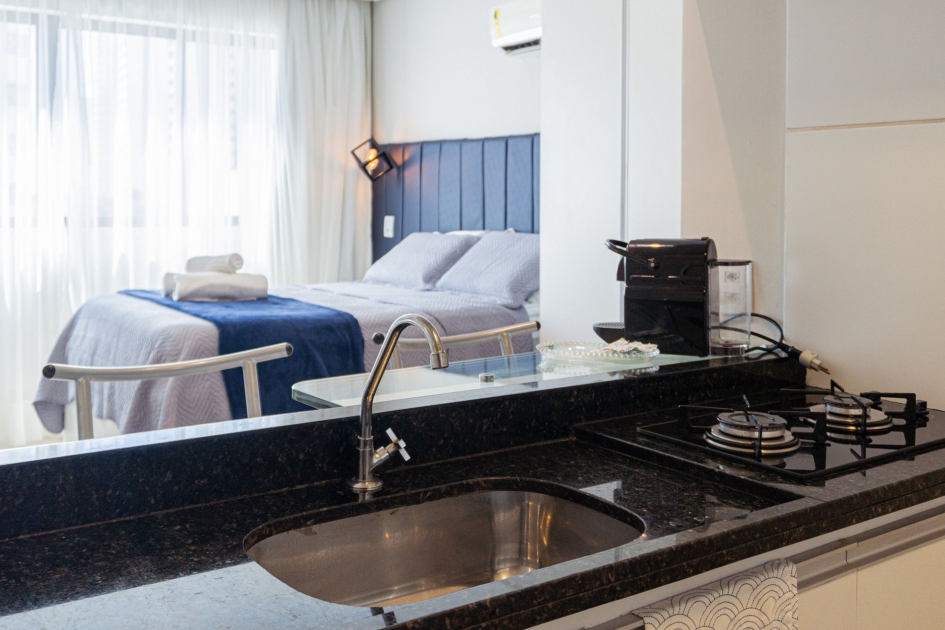 O local é super aconchegante e equipado. Cozinha americana, com todo mobiliário necessário para uma hospedagem confortável: - jogo de jantar, taças, eletrodomésticos -secador de cabelo, ferro de passar -Tv com smart com Netflix -ar condicionado -cortina com “blackout” -sabonete, shampoo, condicionador (cortesia) - vaga de estacionamento coberta.