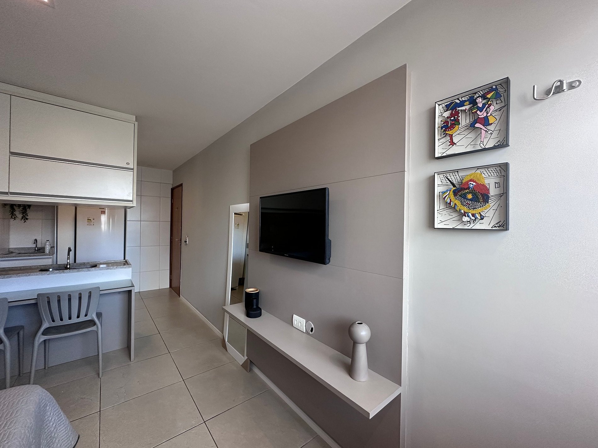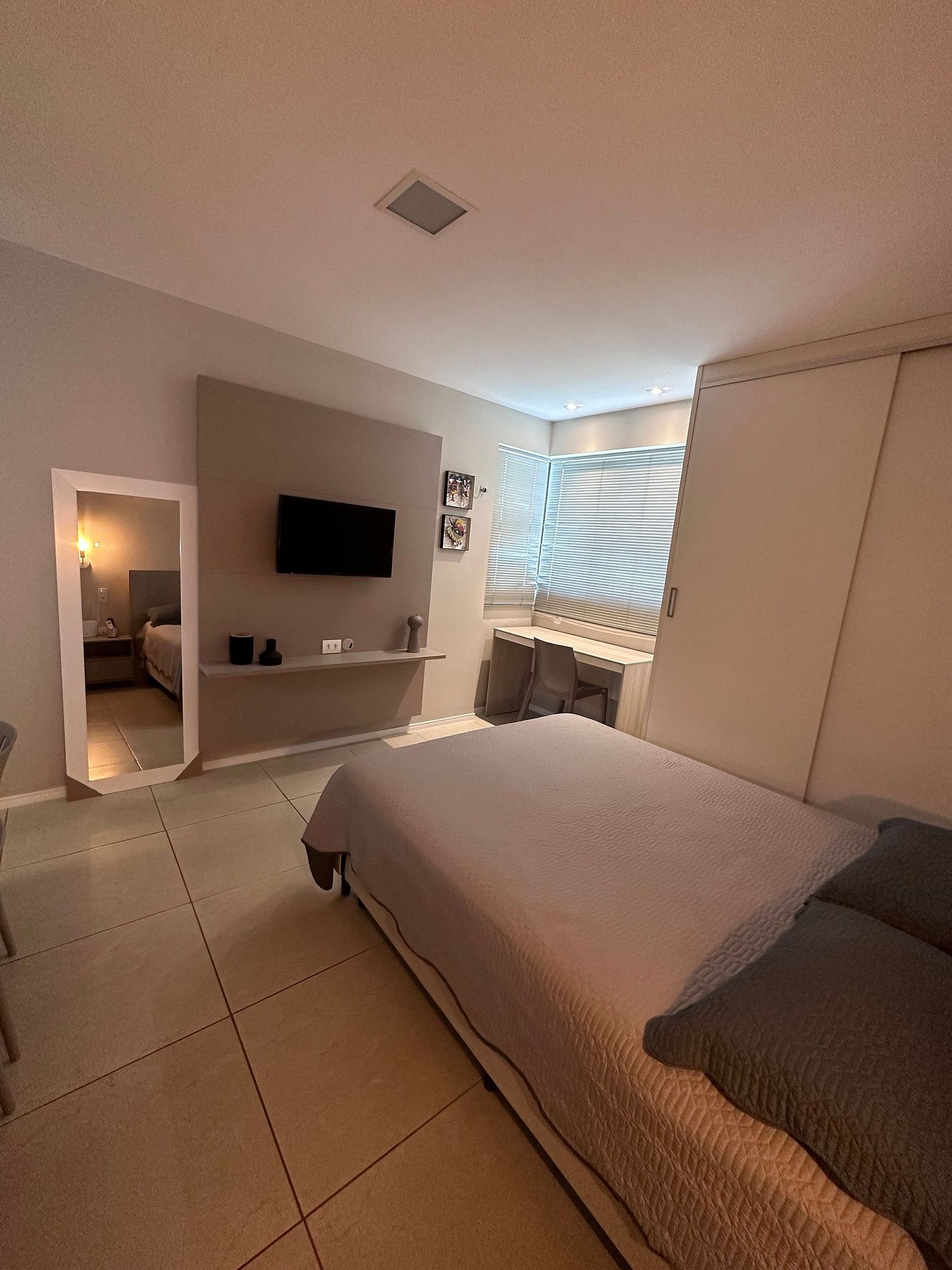 O ambiente é muito aconchegante e bem equipado. Conta com cozinha americana completa, incluindo utensílios, taças e eletrodomésticos essenciais para sua estadia. Oferece itens como secador de cabelo, ferro de passar, TV smart com acesso a Netflix, ar-condicionado de 12.000 BTUs, cortina blackout, além de sabonete, shampoo e condicionador como cortesia. Disponibiliza também vaga de estacionamento coberta.