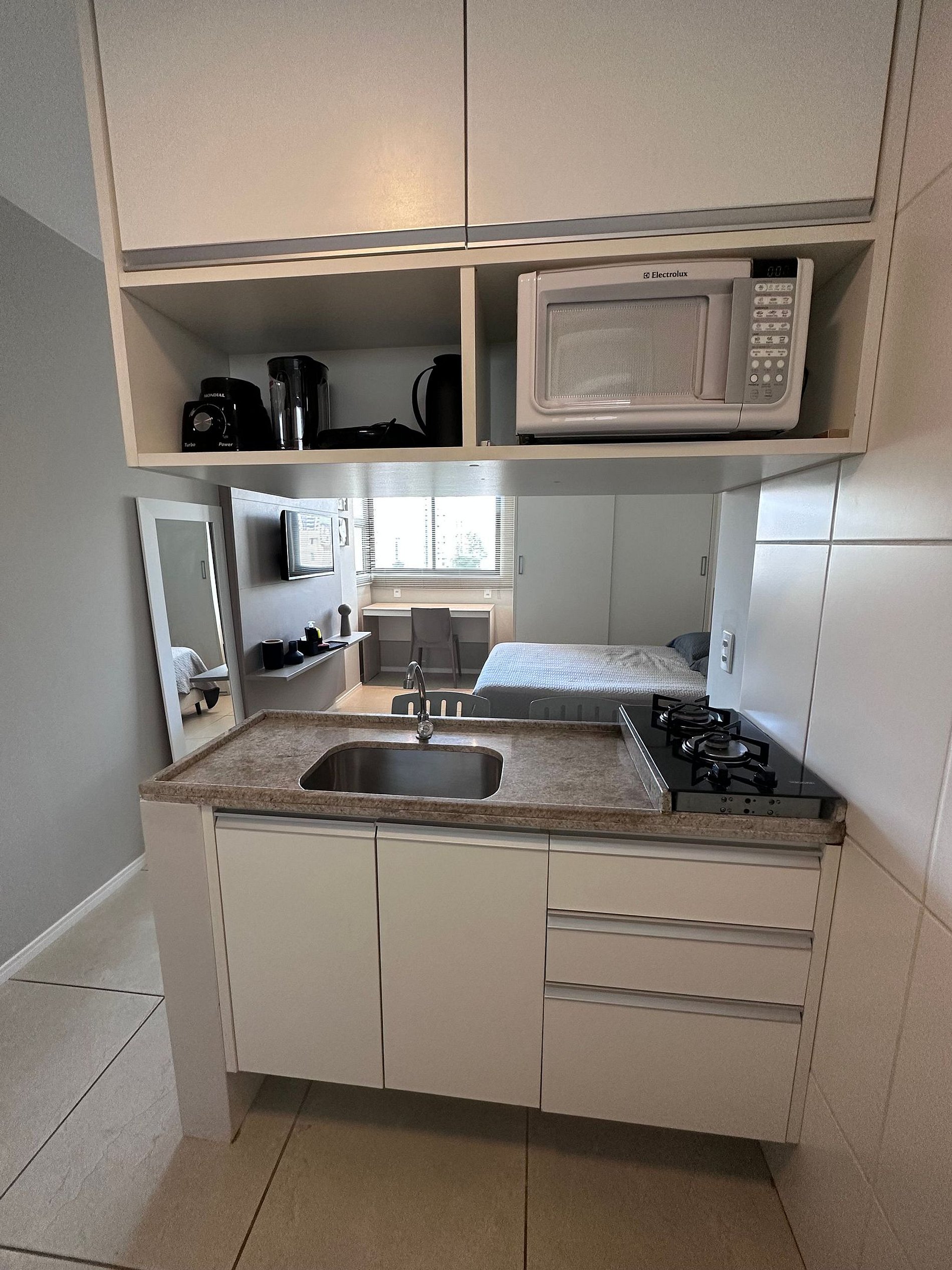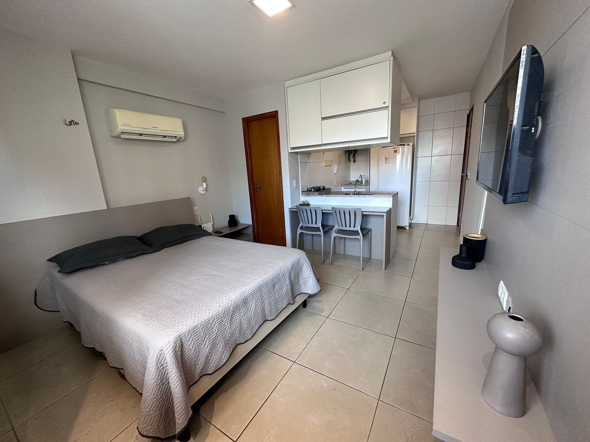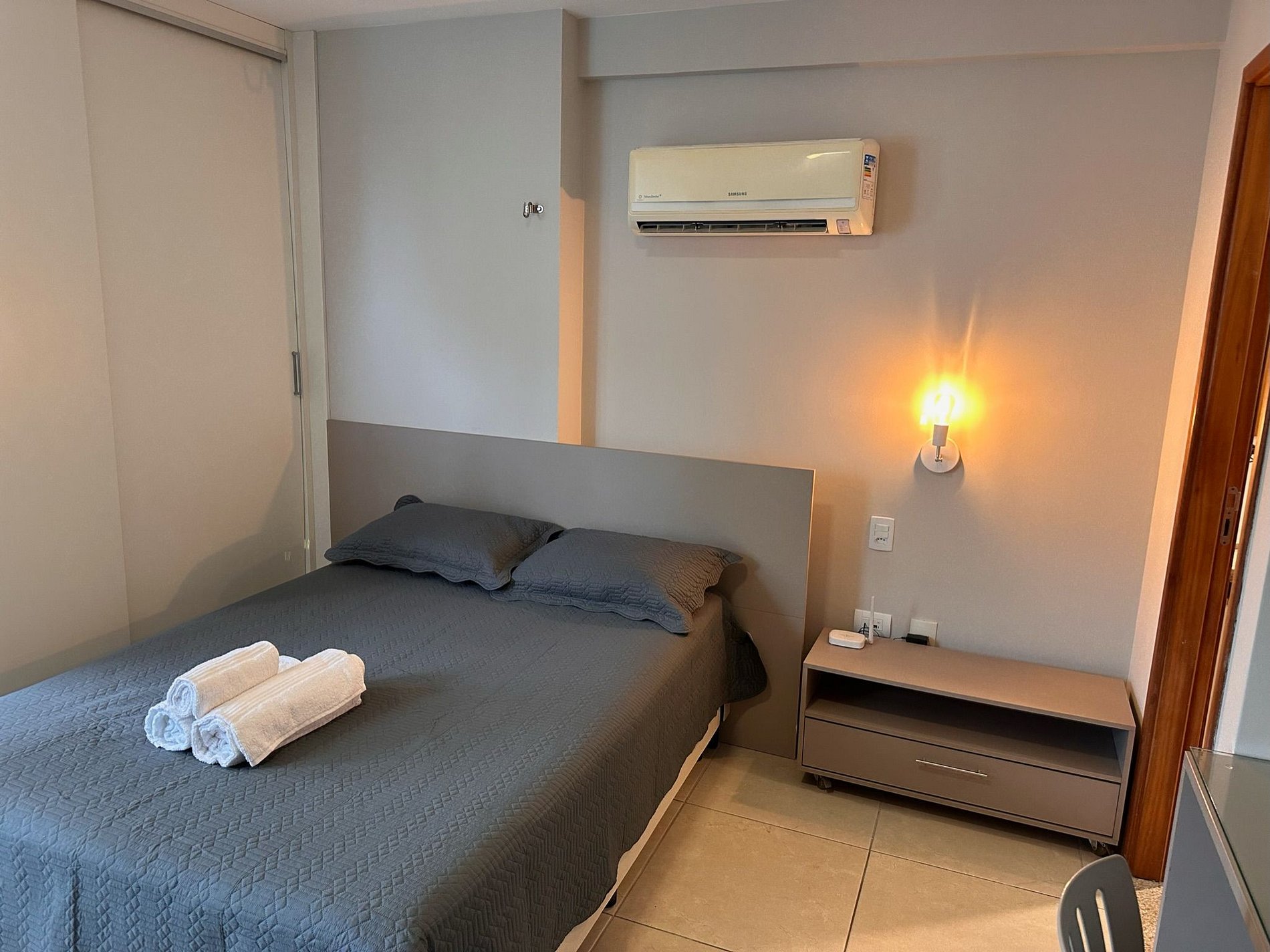 O ambiente é muito aconchegante e bem equipado. Conta com cozinha americana completa, incluindo utensílios, taças e eletrodomésticos essenciais para sua estadia. Oferece itens como secador de cabelo, ferro de passar, TV smart com acesso a Netflix, ar-condicionado de 12.000 BTUs, cortina blackout, além de sabonete, shampoo e condicionador como cortesia. Disponibiliza também vaga de estacionamento coberta.