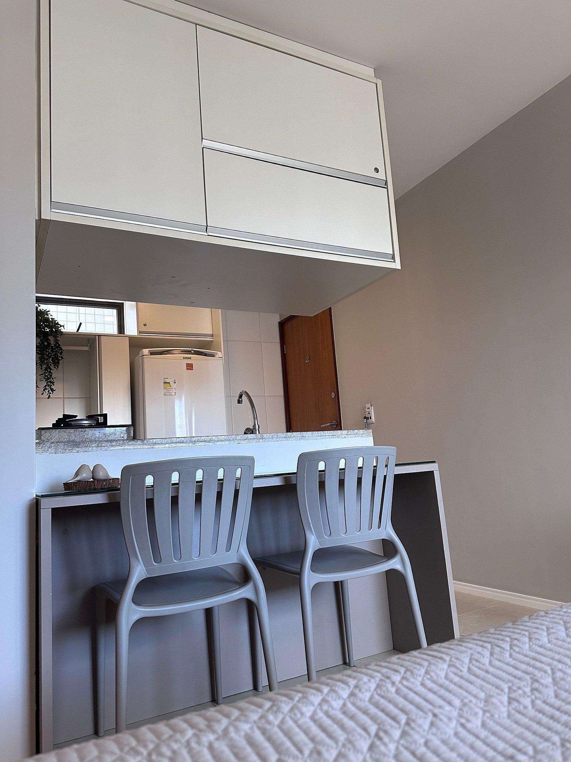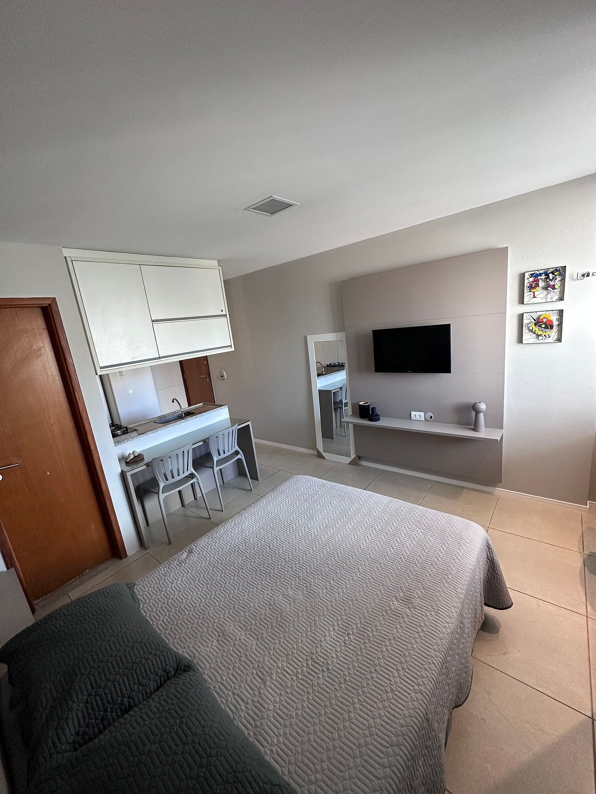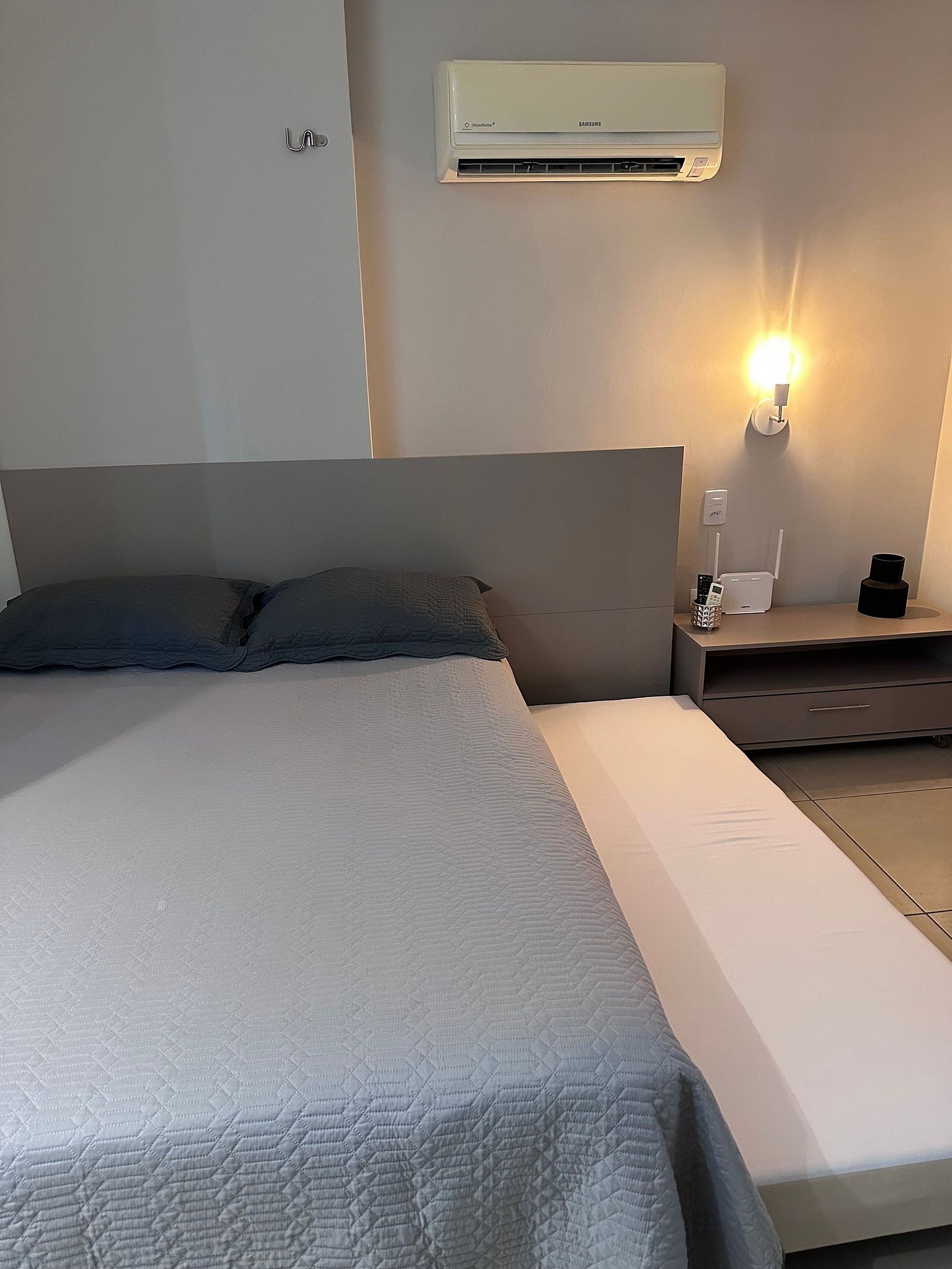 O ambiente é muito aconchegante e bem equipado. Conta com cozinha americana completa, incluindo utensílios, taças e eletrodomésticos essenciais para sua estadia. Oferece itens como secador de cabelo, ferro de passar, TV smart com acesso a Netflix, ar-condicionado de 12.000 BTUs, cortina blackout, além de sabonete, shampoo e condicionador como cortesia. Disponibiliza também vaga de estacionamento coberta.